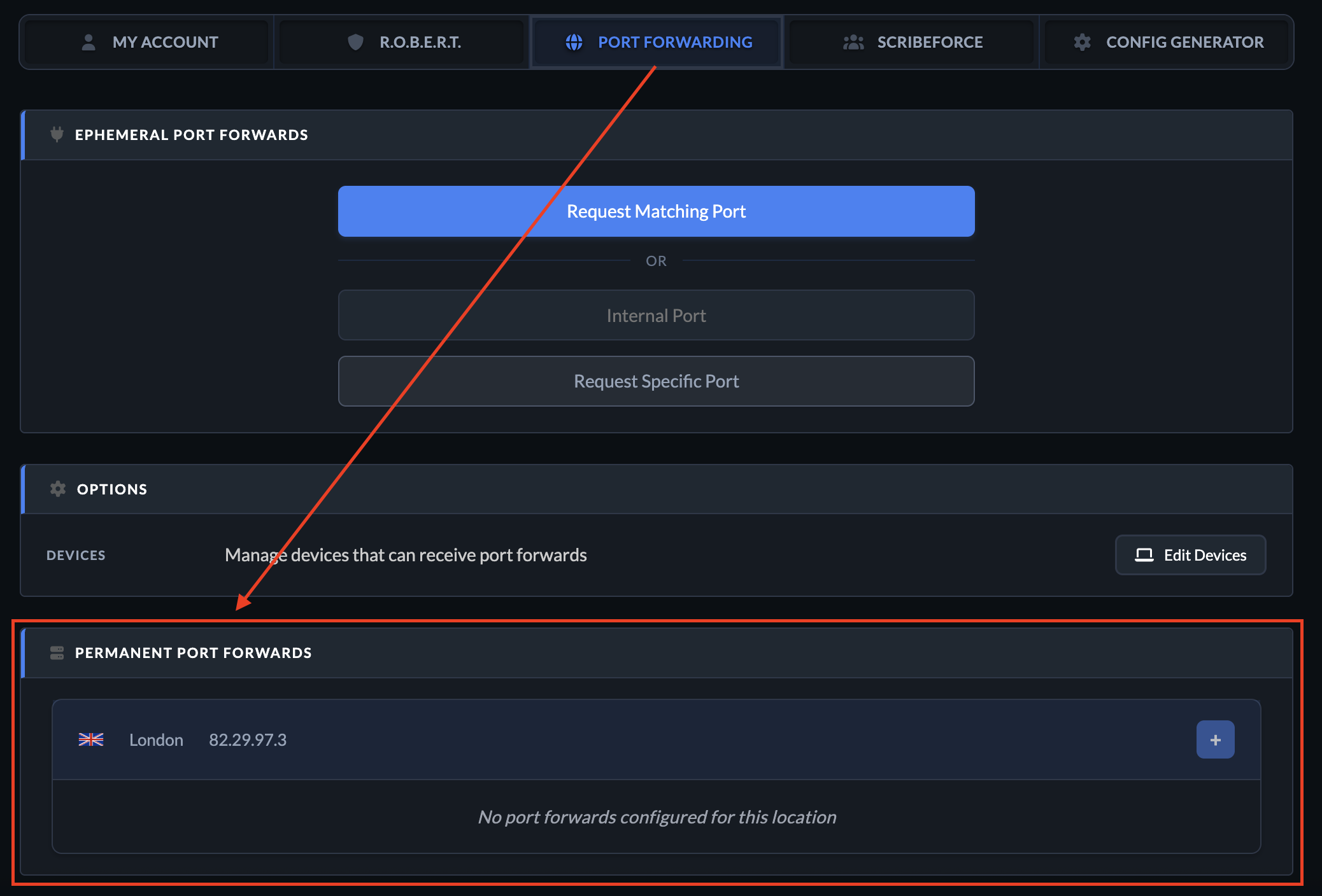 Open a browser, log into the Windscribe website and go to the Port Forwarding tab on the My Account page and scroll down to the Permanent Port Forwards section. You will see all of the static IP servers that you purchased here.